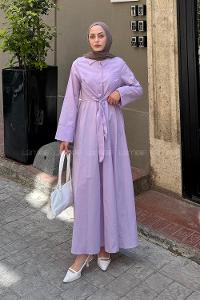 Lamelif Ön Bağlama Detaylı Tesettür Elbise Eflatun