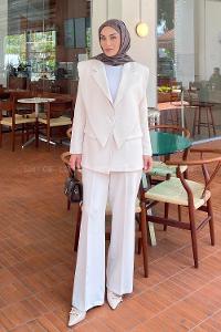 Lamelif Ön Parçalı Blazer Ceket Takım Krem