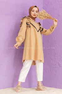 Lamelif Bisiklet Yaka Omuz Fırfırlı Tunik Bej