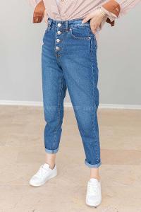 Modalamelif Önü Düğmeli Bel Ve Paça Yırtıklı Mom Jean Koyu Mavi