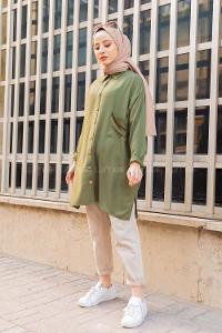 Modalamelif Önü Düğmeli Tek Cepli Gömlek Haki
