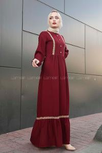 Modalamelif Önü Tahta Düğmeli Hasır Detaylı Elbise Bordo