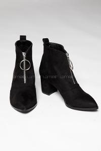 Önü fermuarlı, orta boy blok topuklu, siyah bilekte bot.