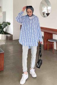 Lamelif Oversize Kalın Çizgi Detaylı Gömlek Mavi