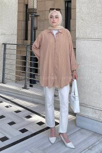 Lamelif Ovesize Gofre Gömlek Sütlü Kahve