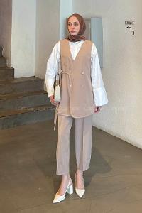 Lamelif Pantolon-Yelek İkili Tesettür Takım Bej