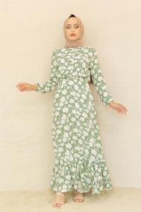 Lamelif Balon Kol Katlı Tesettür Elbise Yağ Yeşili