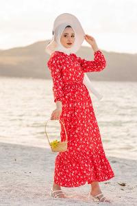 Lamelif Ön Yarım Düğme Detaylı Müslin Kumaş Tesettür Elbise Bordo