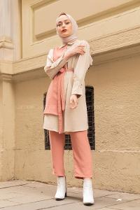 Lamelif Balance Armalı Çımalı İkili Tesettür Takım Camel