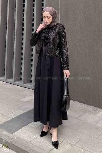 Lamelif Payetli Kurdele Detaylı Ceket Tesettür Takım Siyah
