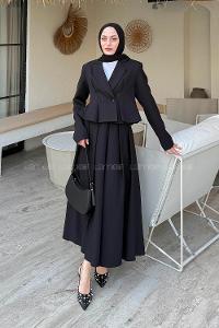 Lamelif Pileli Etek-Kruvaze Ceketli İkili Takım Siyah