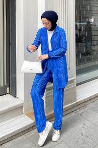 Lamelif Pliseli Saten Kumaş Tesettür Takım Mavi