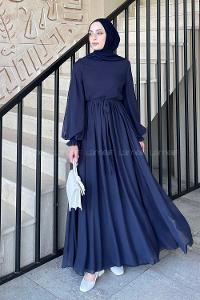 Lamelif Balon Kol Katlı Tesettür Elbise Lacivert