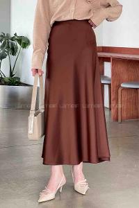 Lamelif Premium Düz Saten Çan Etek Acı Kahve