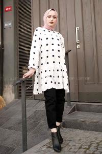Modalamelif Puantiye Desenli Balon Kol Tunik Beyaz