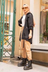 Modalamelif Reglan Kol Detaylı Kapşonlu Kaban Siyah