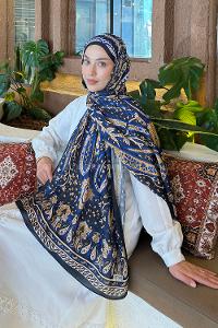 Lamelif Retro Desen Pamuk Şal Lacivert-Gold