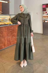 Lamelif Balon Kol Katlı Tesettür Elbise Yağ Yeşili