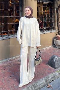 Lamelif Saç Örgülü Triko Tesettür Takım Ekru
