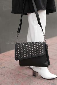 taş detaylı, kapağı asimetrik, şık omuz çantası.