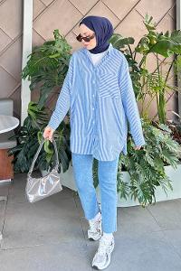 Lamelif Tek Cep Çizgili Gömlek Mavi