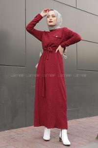 Lamelif Ön Yarım Düğme Detaylı Müslin Kumaş Tesettür Elbise Bordo