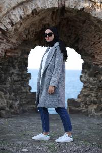 Modalamelif Kuşak Bağlama Detaylı Kaşe Kaban Gri