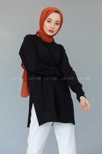 Lamelif Dilvin 30312 Dekoratif Dikişli Bisiklet Yaka Tshirt-Siyah
