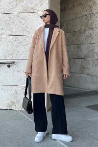 Modalamelif Kuşak Bağlama Detaylı Kaşe Kaban Bej