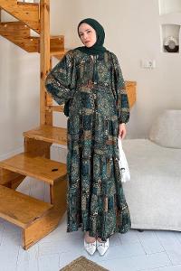 Lamelif Balon Kol Katlı Tesettür Elbise Zümrüt
