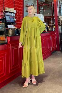 Lamelif Balon Kol Katlı Tesettür Elbise Yağ Yeşili