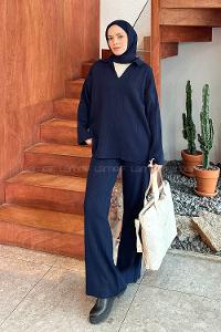 Lamelif Yaka Detay İkili Tesettür Takım Lacivert