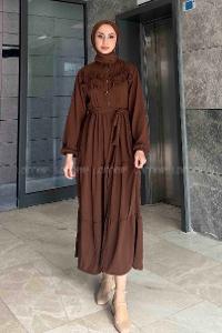 Lamelif Toka Detaylı Tesettür Elbise Kahverengi