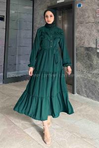 Lamelif Yaka Fırfır Detaylı Yarım Düğmeli Elbise Zümrüt