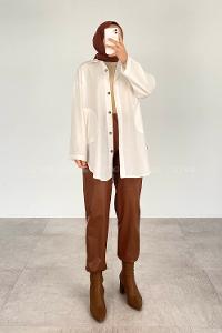 Lamelif Kapaklı İki Cepli Tahta Düğmeli Gömlek Ekru