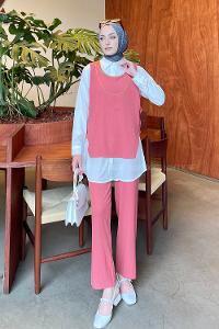 Lamelif Yan Düğme Detaylı Üçlü Bürümcük Tesettür Takım Gül