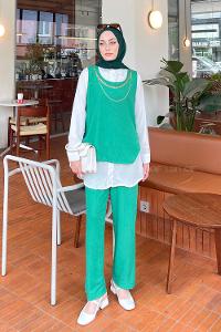 Lamelif Yan Düğme Detaylı Üçlü Bürümcük Tesettür Takım Yeşil