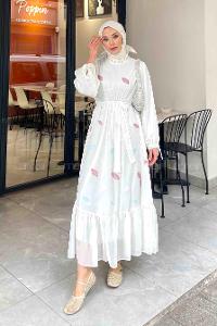 Lamelif Ajurlu Tesettür Elbise Ekru