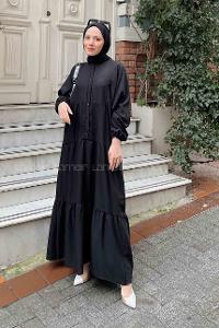 Lamelif Balon Kol Bağlamalı Tesettür Elbise Siyah