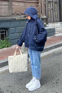 Lamelif Yarasa Kol Kapüşonlu Özel Tasarım Trenç Lacivert