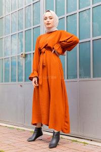 Modalamelif Yarasa Kol Kemer Detaylı Elbise Taba