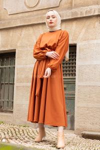 Lamelif Bel Büzgülü Tesettür Elbise Acı Kahve