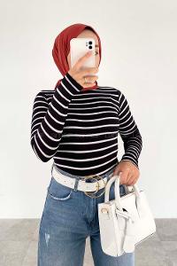 Lamelif Yarım Balıkçı Yaka Çizgili Body Siyah