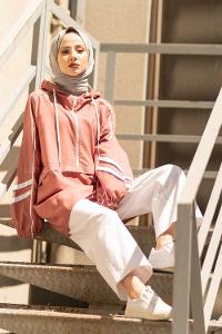 Yarım fermuar detaylı, kol şeritli kapşonlu şık tunik