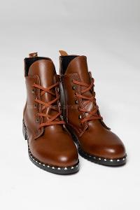 Zımbalı detaylı arkası çekme kayışlı, kalın tabanlı bot. Topuk yüksekliği: 3.5 cm.