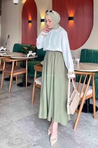 Lamelif Omuz Vatka Detaylı Tesettür Gömlek Yağ Yeşili