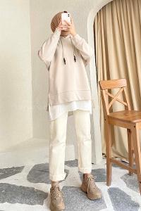 Modalamelif Etek Ucu Garnili Kapüşon Detaylı Yırtmaçlı Anabelle Sweat Bej