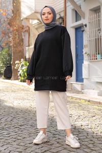 Lamelif Balon Kol Yaka Ve Etek Ucu Manşetli Bol Sweat Siyah