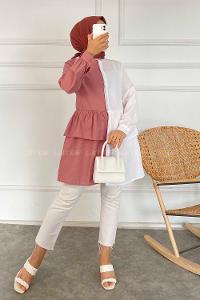 Modalamelif Renk Garnili Beli Fırfır Detaylı Tunik Gömlek Beyaz-Gül