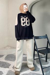 Modalamelif 89 Aplike Nakışlı Bisiklet Yaka Renk Garnili Sweat Siyah